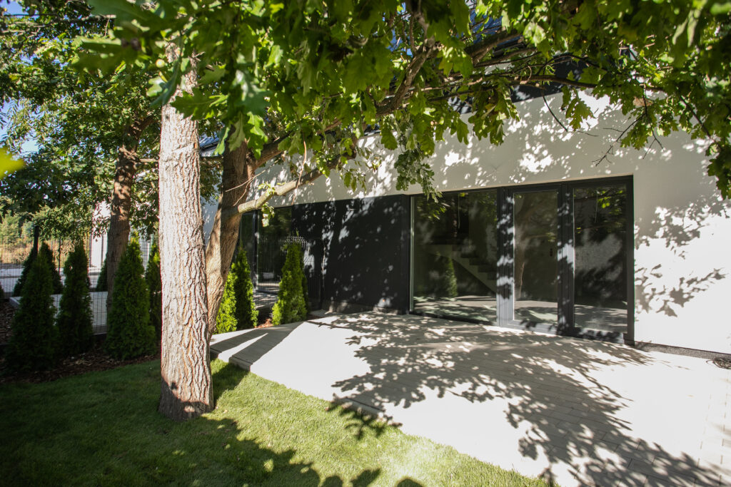 Pozostała duża część terenu jest podzielona wewnętrznie na przynależne każdemu z lokali strefy wyłącznego użytkowania. Autonomiczny lokal posiada własną przestrzeń wejściową, podjazd ze stanowiskiem parkingowym przed garażem oraz wygrodzony płotem zielony ogród z utwardzonym tarasem.