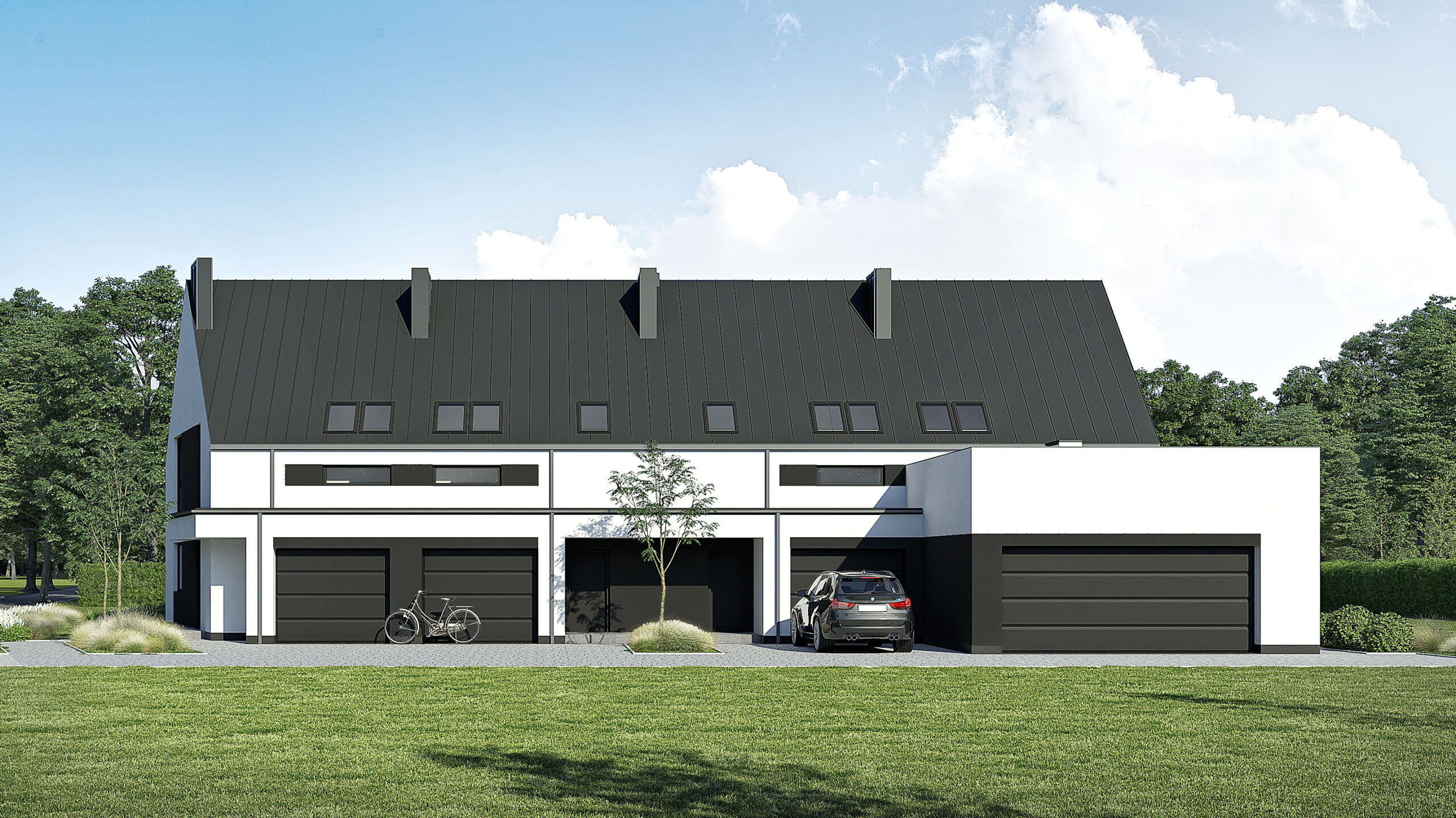 Bryła o ponadczasowej architekturze, w stylu nowoczesnej stodoły z wykuszami garaży i wnękami wejściowymi skrytymi pod okalającym front podcieniem. Budynki niepodpiwniczone, parterowe z poddaszem użytkowym oraz dodatkowym nieużytkowym strychem nad jętkami w dwuspadowym dachu. Ścianka kolankowa na poddaszu o wysokości aż 130 cm zapewnia optymalne wykorzystanie całej przestrzeni pomieszczeń.